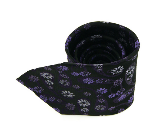 Cravata Material: matase jacquard 100%. Dimensiuni: 150 cm x 10 cm. Stil & Culoare: Modele florale; negru, violet, alb. Ambalaj special, hand made; designer italian.