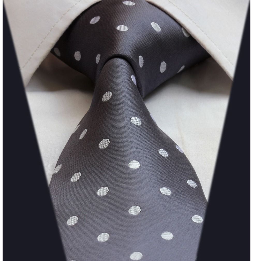 Cravata Material: matase jacquard 100%. Dimensiuni: 150 cm x 8.5 cm. Stil & Culoare: Model cu buline albe medii; grey, alb. Ambalaj special, hand made; designer italian.