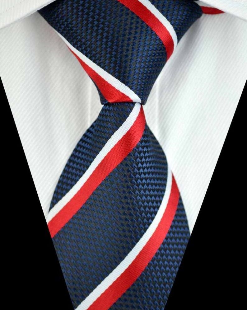 Cravata Material: matase jacquard 100%. Dimensiuni: 150 cm x 10 cm. Stil & Culoare: Model in dungi; negru, rosu, albastru inchis, alb. Ambalaj special, hand made; designer italian.