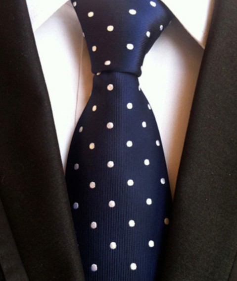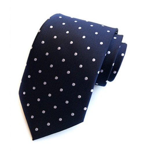 Cravata Material: matase jacquard 100%. Dimensiuni: 150 cm x 8 cm. Stil & Culoare: Model cu buline albe medii; albastru navy, alb. Ambalaj special, hand made; designer italian.