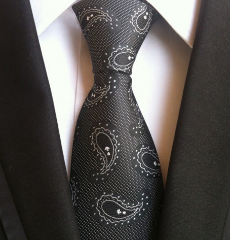 Cravata DemiSlim Material: 100 % matase jaquard. Dimensiuni: 150 cm x 8 cm. Stil & Culoare: Modele paisley, alb, negru. Ambalaj special, hand made; designer italian