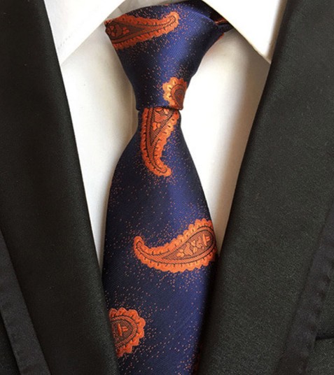 Cravata DemiSlim Material: matase jaquard. Dimensiuni: 150 cm x 8 cm. Stil & Culoare: Modele paisley, albastru navy, orange. Ambalaj special, hand made; designer italian