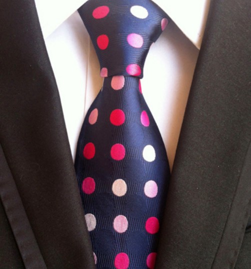 Cravata DemiSlim Material: matase jaquard. Dimensiuni: 150 cm x 8 cm. Stil & Culoare: Model cu buline medii; bleu marin roz, rosu, alb. Ambalaj special, hand made; designer italian