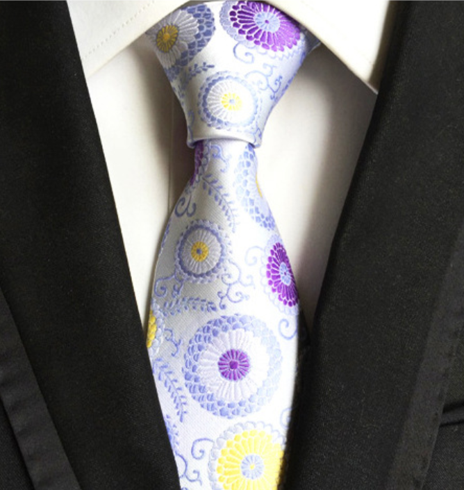 Cravata Material: matase jacquard. Dimensiuni: 150 cm x 8 cm. Stil & Culoare: Motive geometrice si florale; alb, violet, galben, albastru. Ambalaj special, hand made; designer italian.